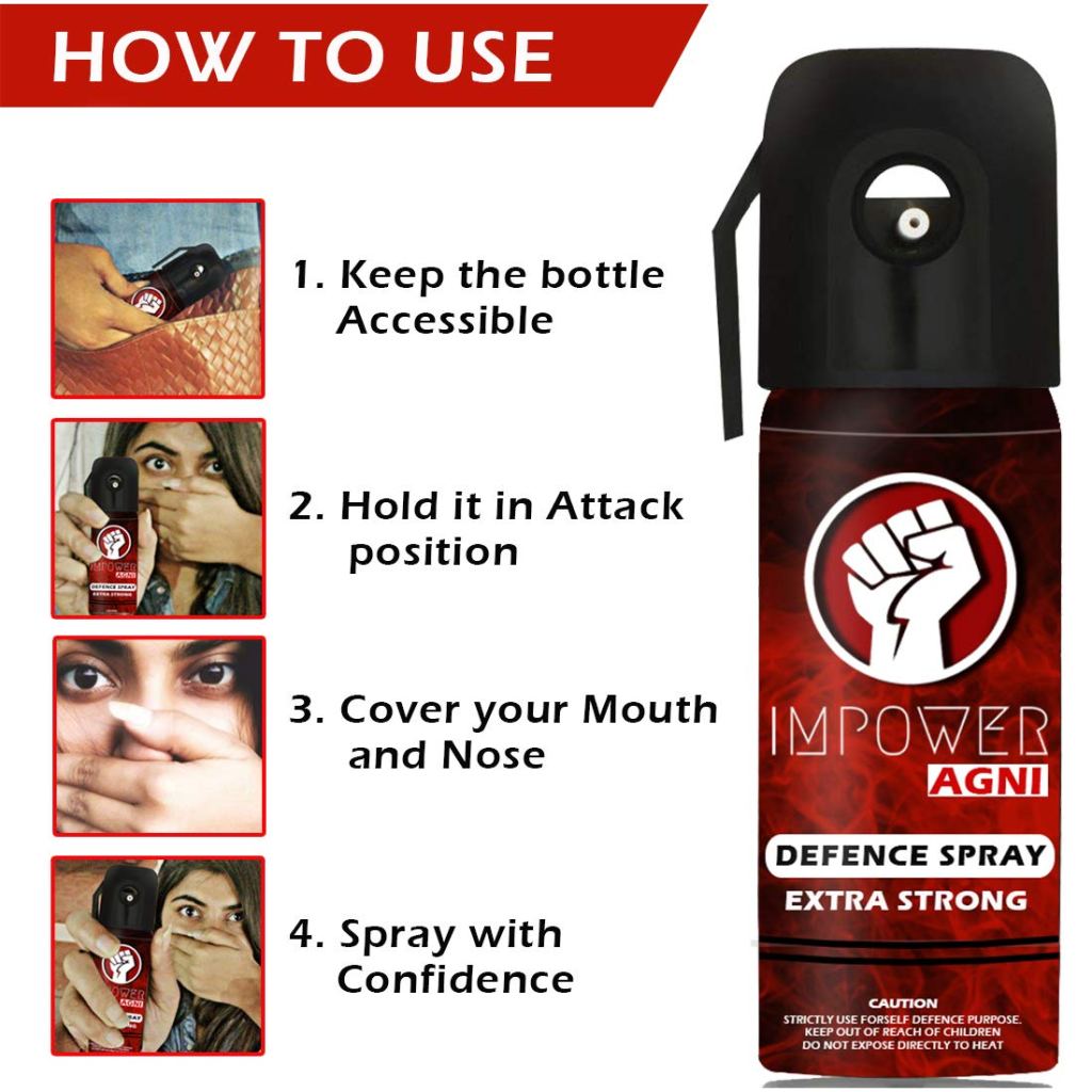 - TOO HANDY :The Impower AGNI Extra Strong Pepper Spray (self defence) for women protection has a very handy bottle which does not necessarily takes additional space in your bag with little or no space allocation. This little self defence pepper spray for women, is all you need to carry with your anywhere you go and feel a sense of security 24*7.